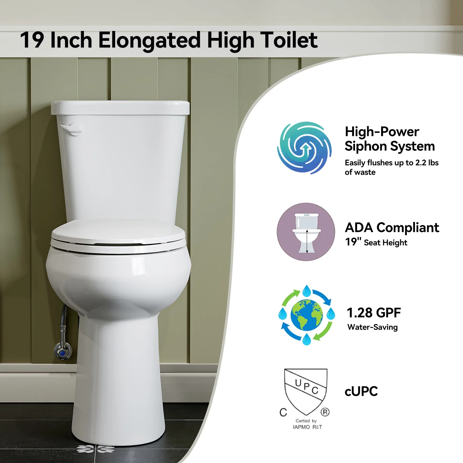 The HOROW E02S elongated two-piece toilet features a comfortable 19-inch ADA-compliant height, a powerful jet siphon flush, and efficient single-flush design. Ideal for 12-inch rough-in installations, it combines functionality and style for modern bathroom solutions.